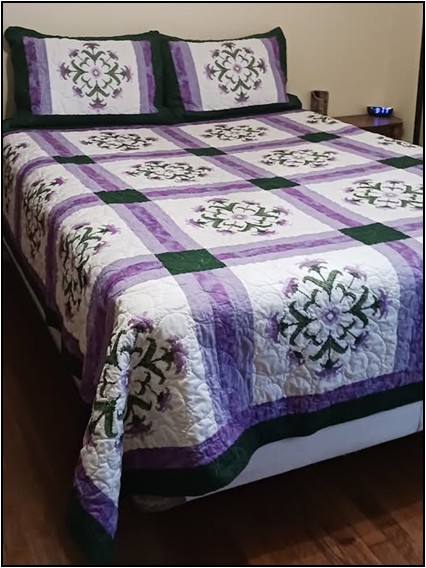 Cindy wrote the following: The pantograph used for the quilting is called “water course” which I thought appropriate as John and Betty crossed an ocean. The name of the quilt “Family Forever” is a play on Scotland’s slogan “Scotland Forever” – a phrase used to express allegiance to Scotland. In Scottish Gaelic it translates literally to “Scotland until judgement”. The slipcover is oversized and left unfinished. This fabric and the other two pieces can be used for repairs or whatever the owner chooses to do with it. The cross-stitched blocks are likely a poly/cotton blend. All other fabrics are 100% cotton. The batting used is 80/20 cotton and polyester. Wash in cold or warm water on delicate because of the cross-stitching. Dry the same. I’m a self-taught quilter. Any mistakes are mine.